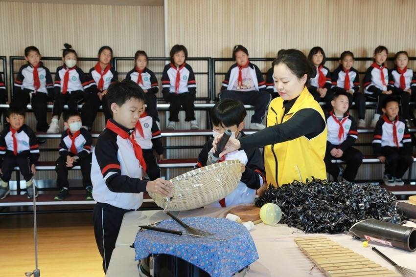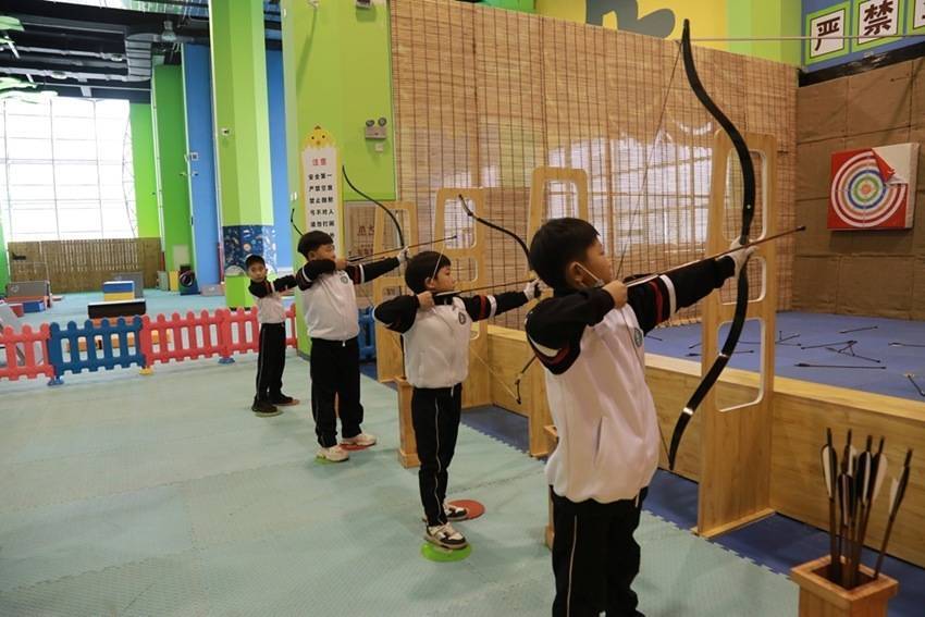 在“小小拟音师”课堂上,学生们尝试用揉搓磁带卷来模仿脚步声,在亲身体验中探索声音的奥秘。在“民族服装秀”环节,孩子们换上各种民族服装,这种有趣的体验让他们增强了民族团结的意识。在“小小弓箭手”课程中,学生们努力保持标准的射箭姿势。他们需要集中目光瞄准靶心,然后平稳地放开弓弦,这个过程有效锻炼了他们的专注力和心理素质。