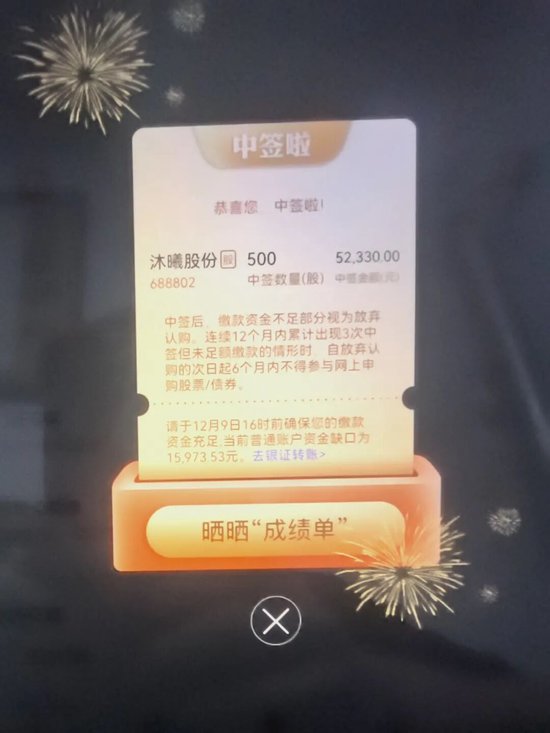 “中签通知是先来短信的,我当时没太在意。直到打开券商App,弹窗放了满屏烟花,给了我一种‘中了奖’不真实的感觉。直到客服打电话来,说‘恭喜您中签’,还开玩笑让我考虑换辆车。”老陈表示,他才意识到,可能中了一个类似摩尔线程的“肉签”,那一瞬间还是觉得有点不可思议。