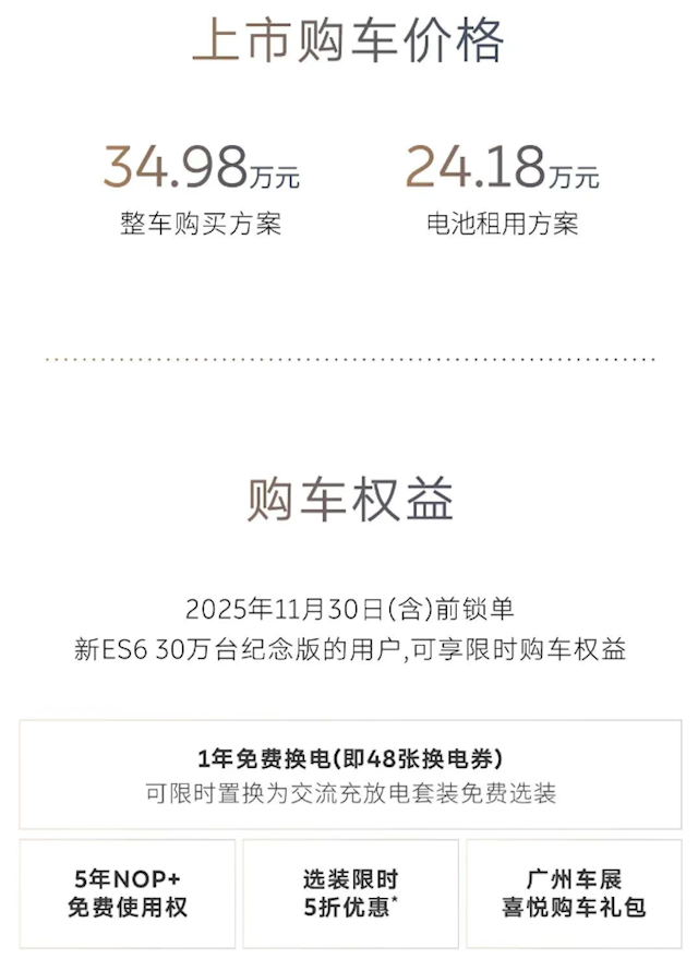 同时官方表示,2025年11月30日(含)前锁单,新用户可享受1年免费换电(48张换电券)、可限时置换为交流充放电套装免费选装、5年NOP+免费使用权等多重购车礼。